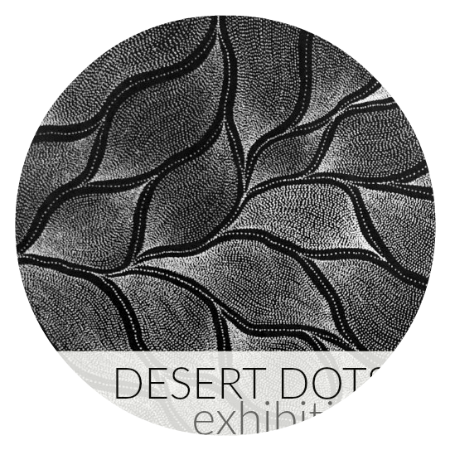 Desert Dots III exhibition is a collection of monochromatic works paired with dot paintings dominated by vibrant purple and orange hues.