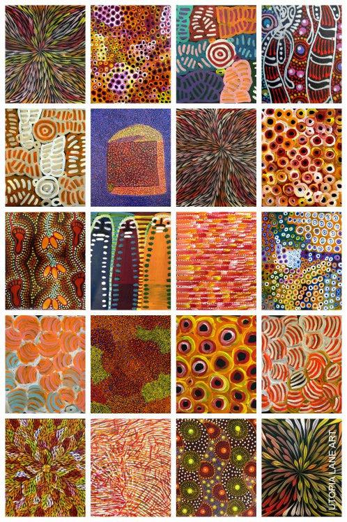 The collection features eighteen unique artworks, each one hand painted by Lena Pwerle, a traditional elder in her 80's, depicting the Soakage dreaming.