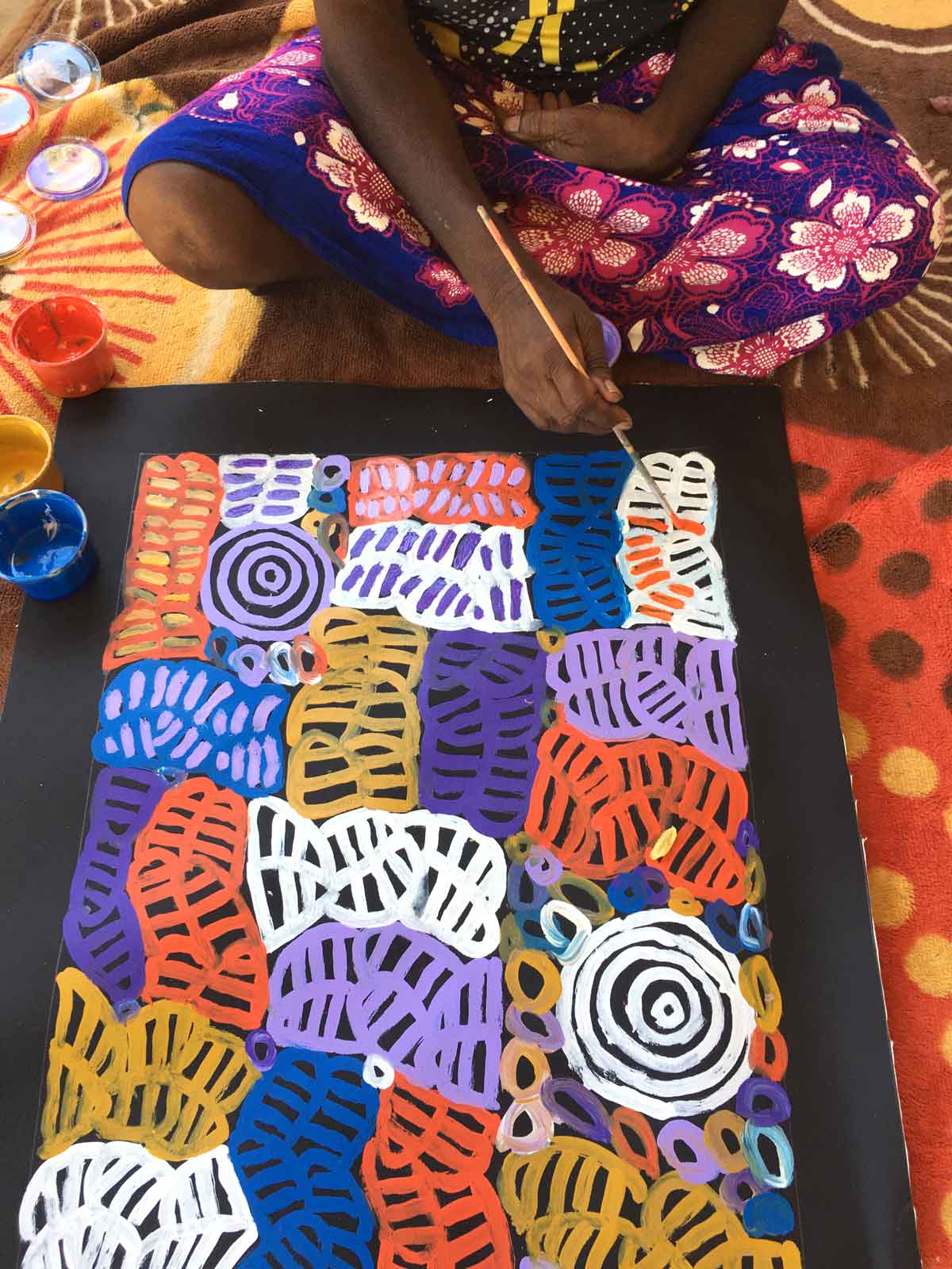 Linear designs represent women’s ceremonial body paint designs for Atnwengerrp country and concentric circles represent waterholes across the land. Small circles represent anemangkerr which is a small bush melon that is sacred to the people of Atnwengerrp.