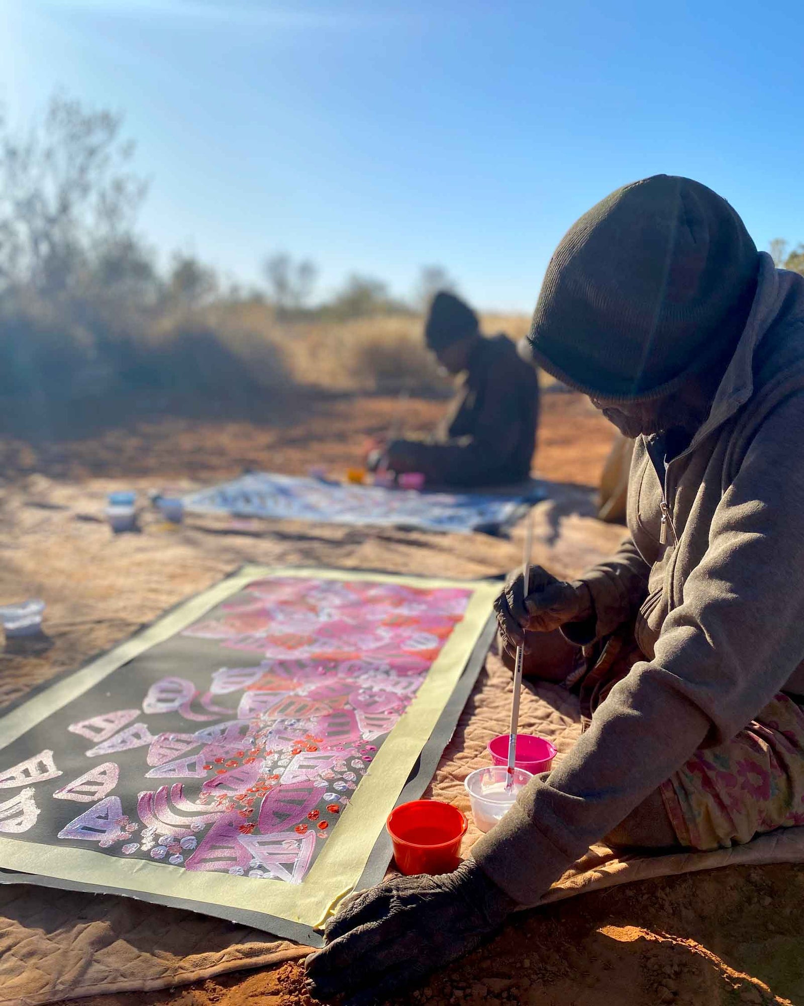 Canvas is laid out on blankets that blend into the red earth, and rocks are placed on corners of the canvas to save the paintings from being caught in the wind.
