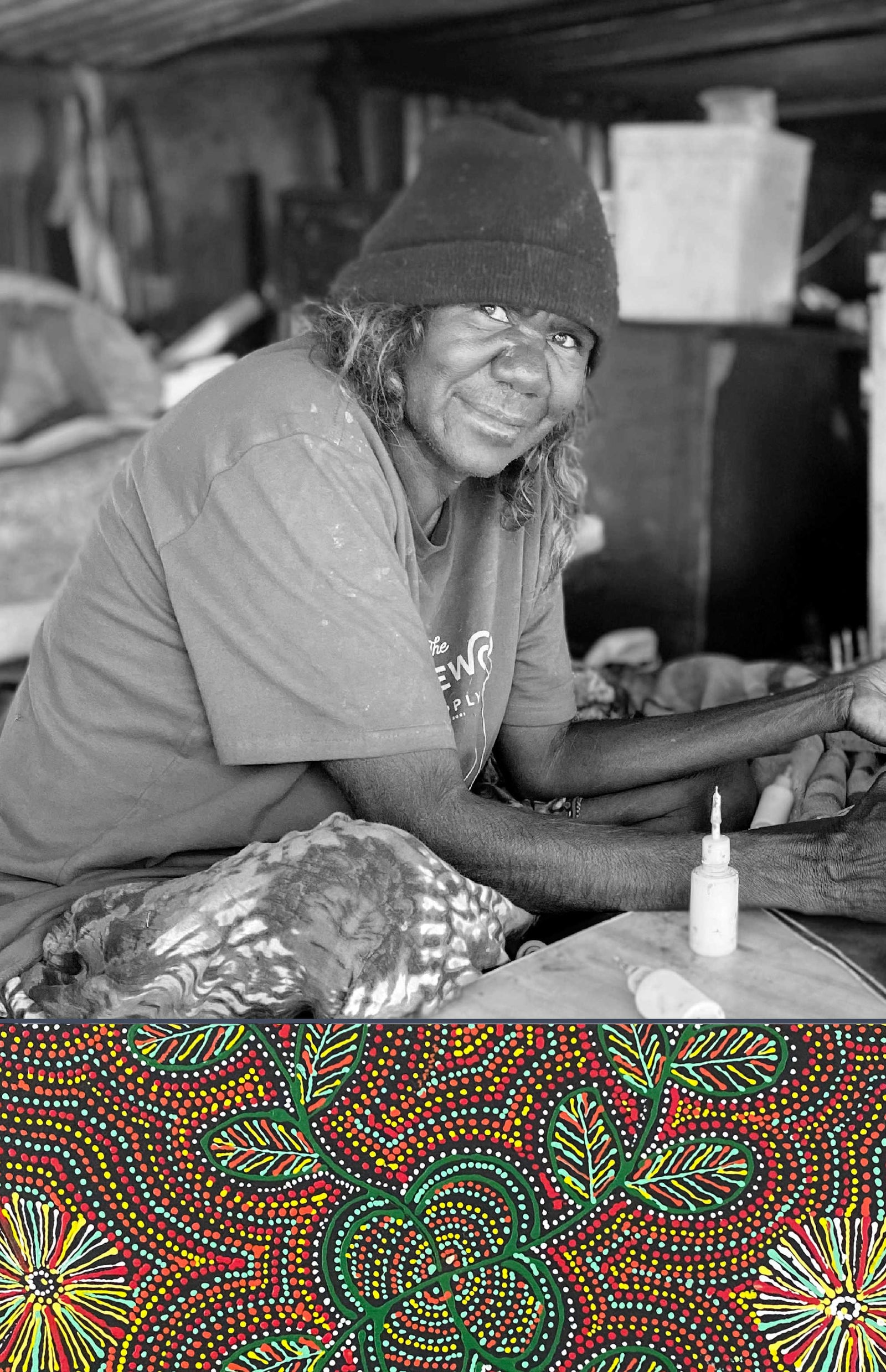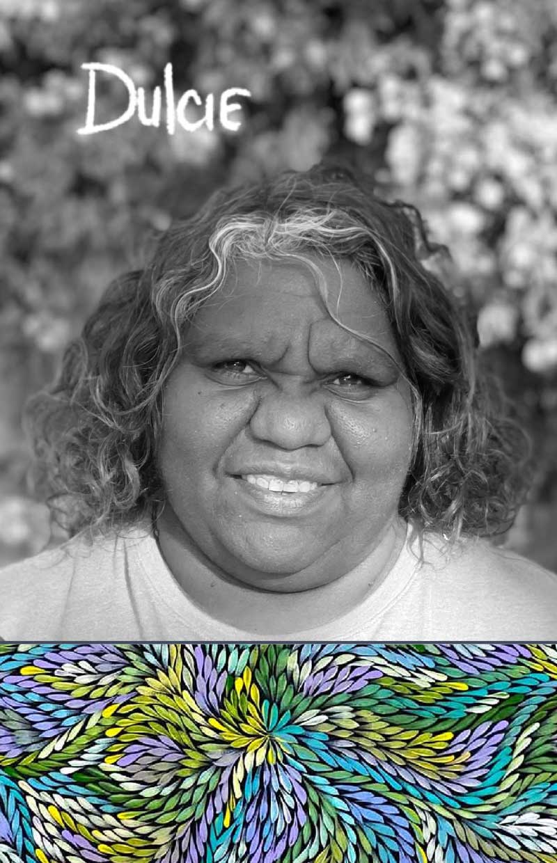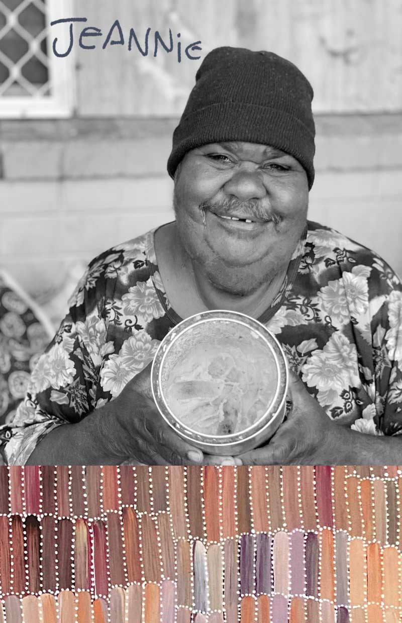 Jeannie is an Australian artist known for her beautiful depictions of the Desert Yam. She is also a 58 year old, a natural born leader, community provider, daughter of a ngangker (a bush doctor or healer), niece of an elder, a sister, a foster parent and a fur baby mumma.