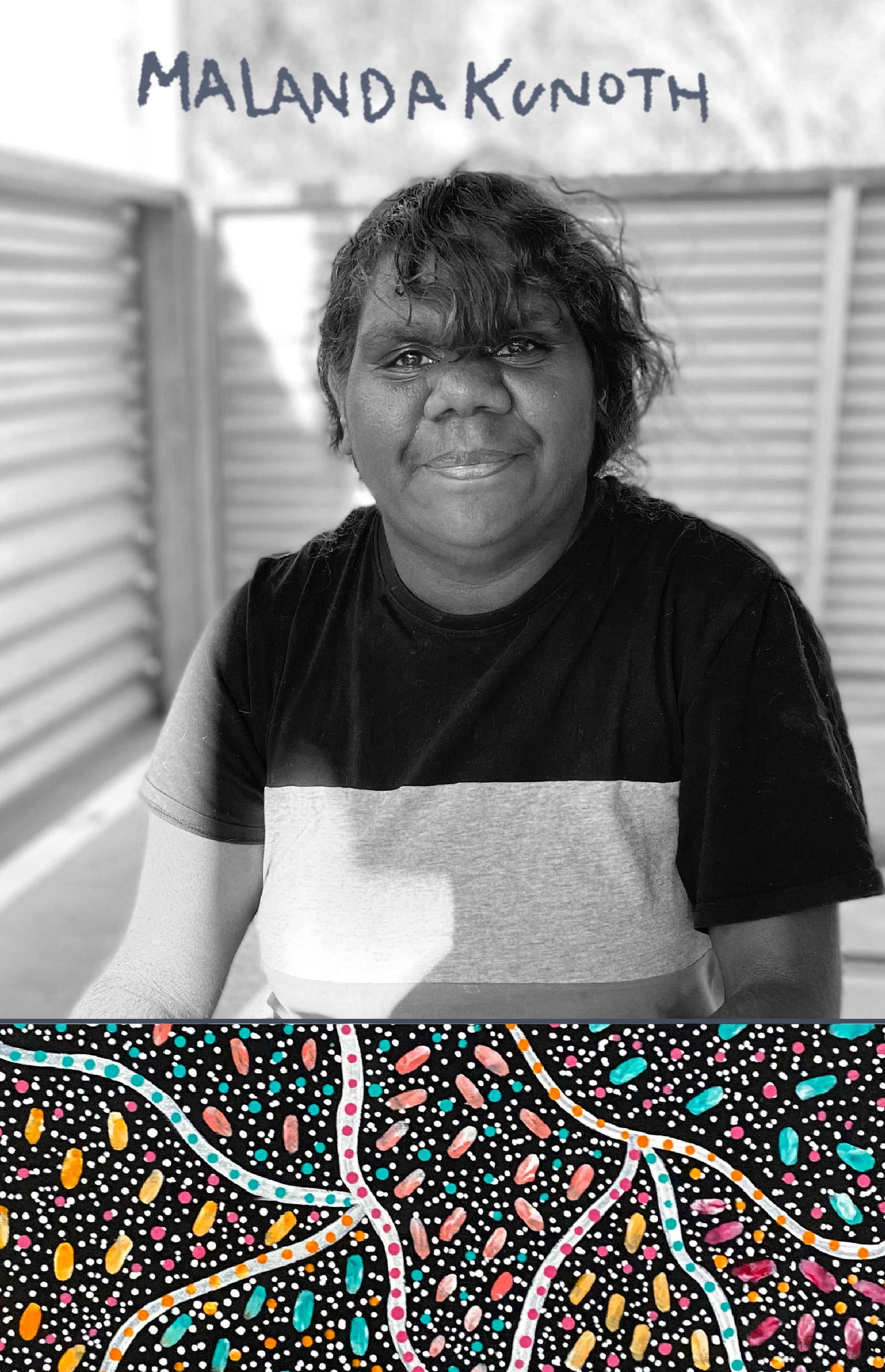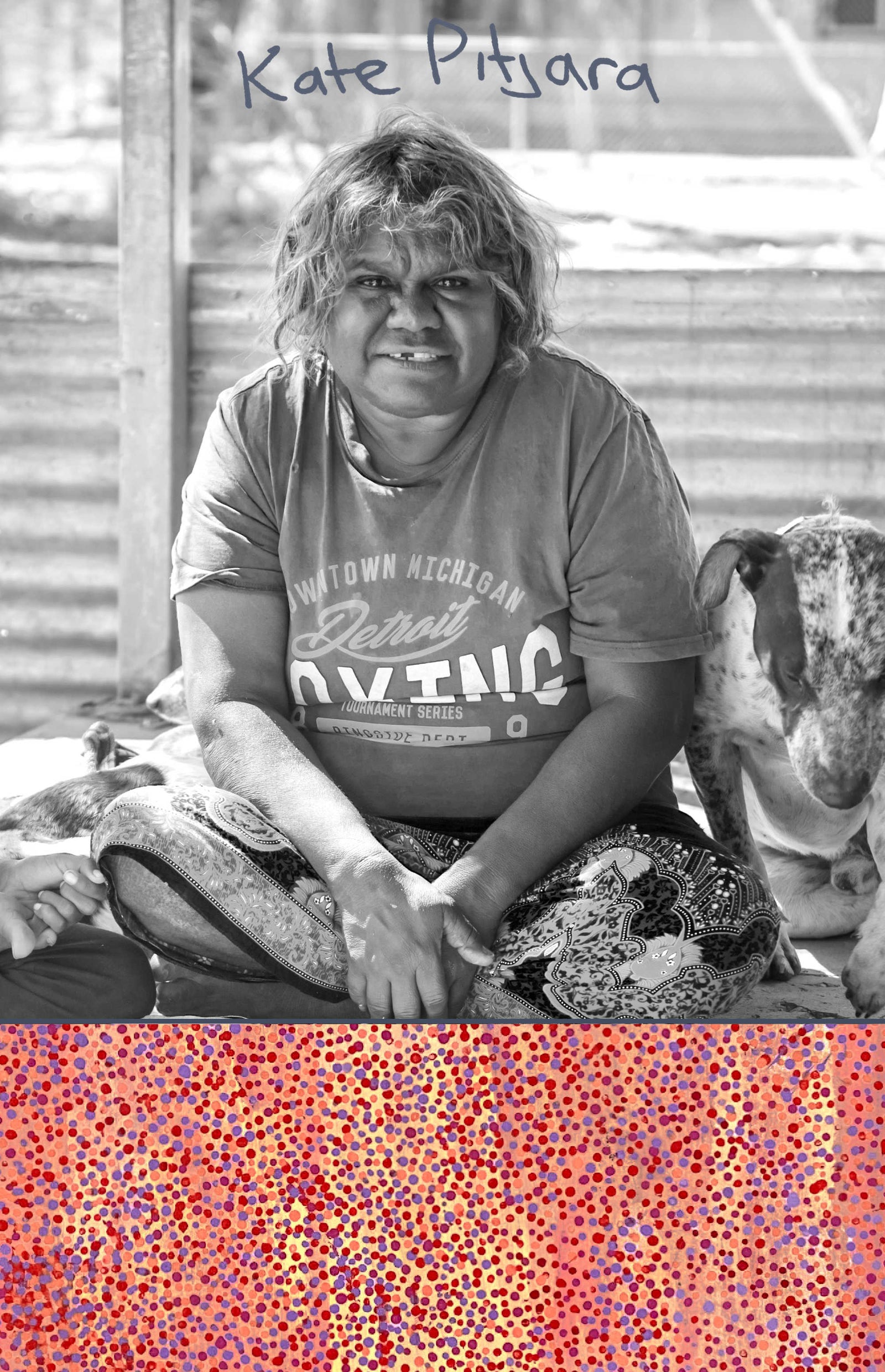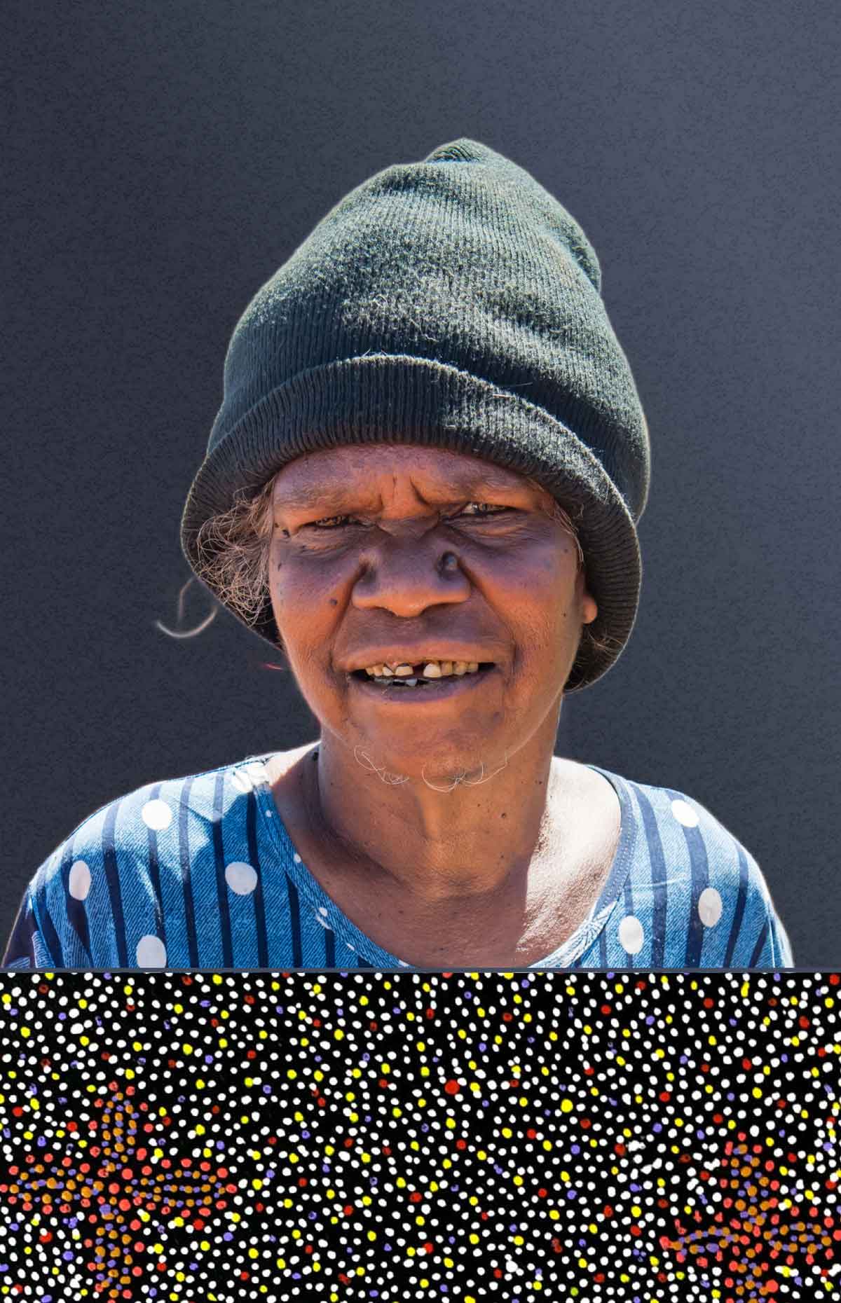 Jeannie is an Australian artist known for her beautiful depictions of the Desert Yam. She is also a 58 year old, a natural born leader, community provider, daughter of a ngangker (a bush doctor or healer), niece of an elder, a sister, a foster parent and a fur baby mumma.