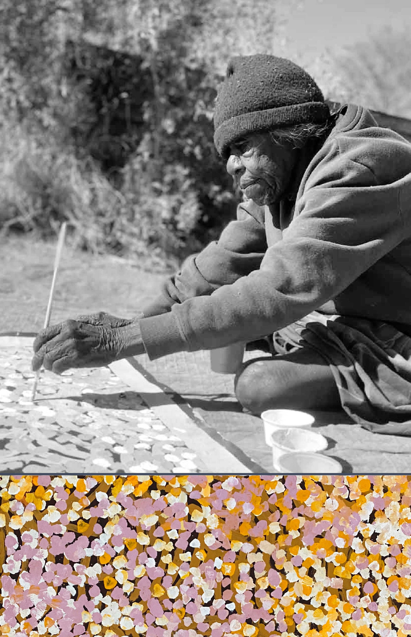 Dora's art is inspired by her mother, Minnie Pwerle's, country. Symbols represent awelye (women's body paint), anemangkerr (bush melons) and an old waterhole symbol that is found etched into the rocks at Anthep; a sacred women's site on her mother's country, Atnwengerrp.