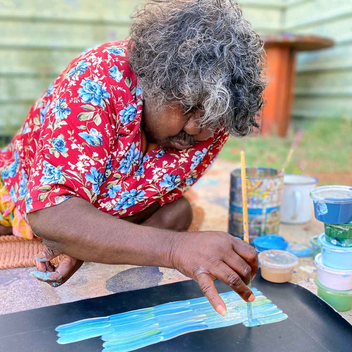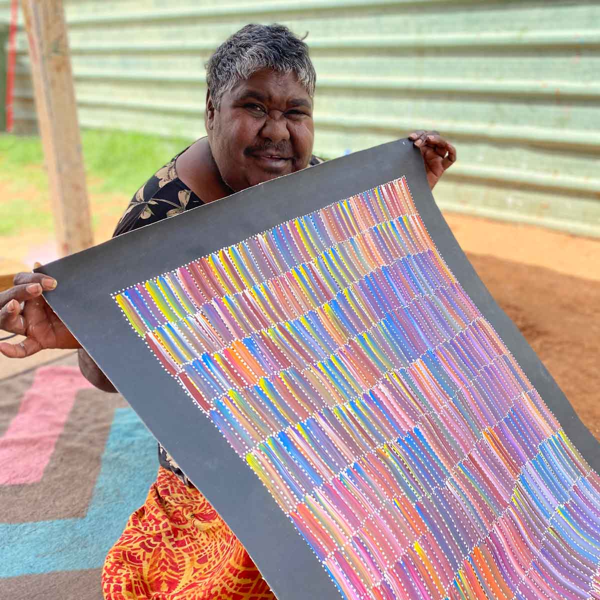 She has been painting since the 1990's and spent a lot of time doing so with the late Ahalpere elder, Lena Pwerle. She also remembers being around when Emily Kame Kngwarreye, her grandfather's sister, was painting three decades ago.
